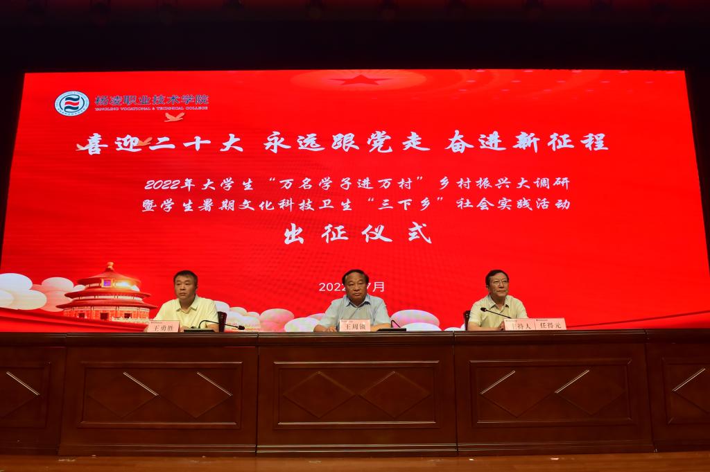 王勇胜在讲话中指出,暑期“三下乡”社会实践活动是广大青年学生“向实践学习,向人民群众学习”的重要载体,是培养广大青年学生历史使命感与社会责任感的重要途径。他希望,全体学生怀着青春的报国之心,在社会实践活动中树立起在基层建功立业的成才志向;怀着谦逊的学习之心,在社会实践活动中不断提高自身综合素质;怀着火热的志愿之心,在社会实践活动中为广大群众提供扎实有效的服务;怀着深厚的爱校之心,在社会实践活动中展现新时代杨职学子风采,努力成为理想远大、信念坚定的新青年,品德高尚、意志顽强的新青年,视野开阔、知识丰富的新青年,开拓进取、艰苦创业的新青年。