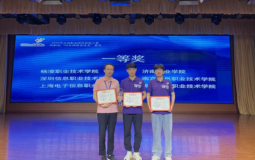 8月22日至23日,2022年全国职业院校技能大赛高职组“5G全网建设技术”赛项在济南职业学院举办,来自全国28个省、56支代表队、112名选手参加了比赛。经过8个小时的激烈比拼,我校信息工程学院学生郑嘉昊、曹文森以总分排名全国第一的成绩,荣获一等奖第一名,取得我校自参赛以来历史最好成绩,指导教师康晋、陈高锋荣获大赛优秀指导教师奖。