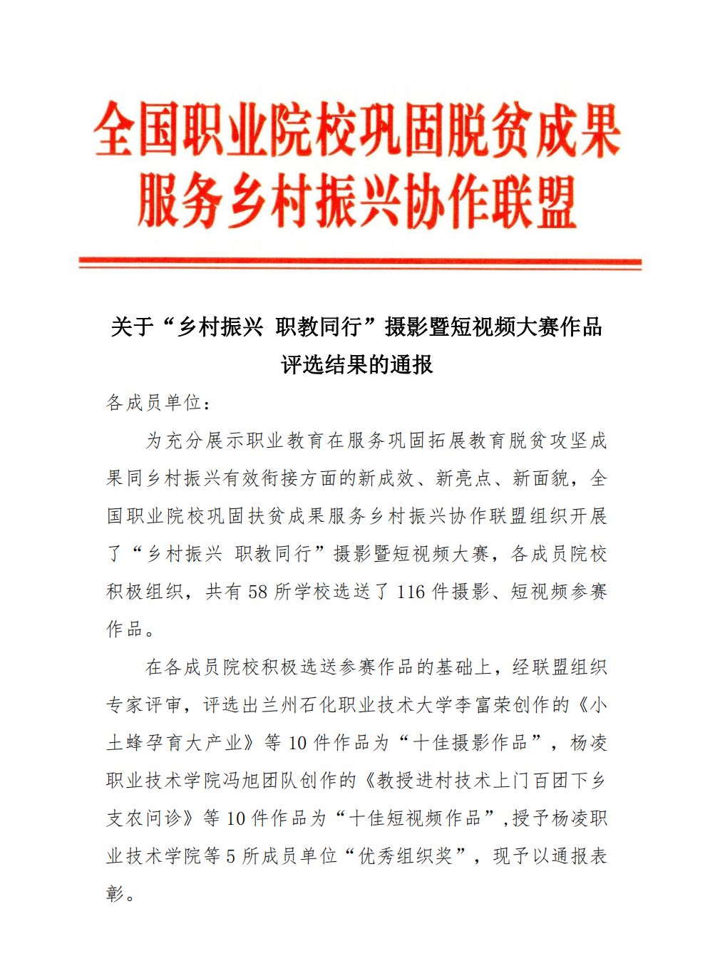 本次大赛共有58所学校选送了116件摄影、短视频参赛,充分展示了职业教育在服务巩固拓展教育脱贫攻坚成果同乡村振兴有效衔接方面的新成效、新亮点、新面貌,分享了乡村振兴好经验和做法,传递了职业教育助力乡村振兴最强音。