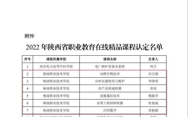 1129日,省教育厅发布2022年陕西省职业教育在线精品课程认定结果,我校田万强负责的《动物生物技术》、李国秀负责的《分析仪器使用与维护》、雷琼负责的《农产品快速检测》、杨振华负责的《设施栽培技术》、杜旭斌负责的《水利工程材料检测》、苏娟丽负责的《应用数学6门课程获评,认定总数和比例均居全省高职院校前列。