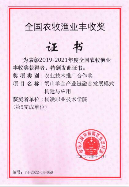 近日,2019—2021年度全国农牧渔业丰收奖获奖名单公布,我校动物工程学院侯金星副教授参与申报的“奶山羊全产业链融合发展模式构建与应用”项目,获得全国农牧渔业丰收奖农业技术推广合作奖,侯金星为第五完成人,杨凌职业技术学院为第五完成单位。