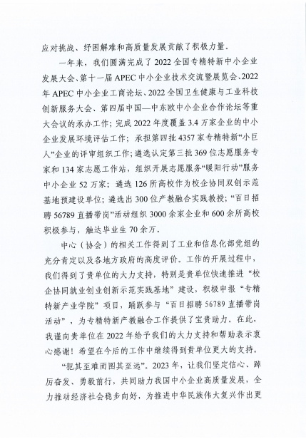 1月17日,新春佳节来临之际,工业和信息化部中小企业发展促进中心向我校发来感谢信,对我校2022年给他们的支持和帮助表示衷心感谢,希望在今后的工作中继续得到我校更大的支持。