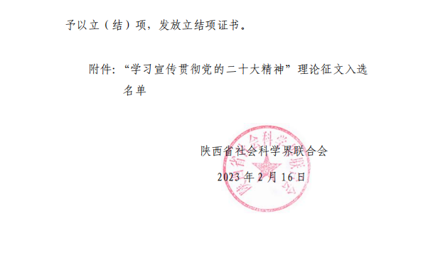 2月16日,省社会科学界联合会公布“学习宣传贯彻党的二十大精神”理论征文入选名单,我校马克思主义学院教师张中世、韩荣彦撰写的论文《弘扬延安精神 牢记“三个务必”》成功入选。