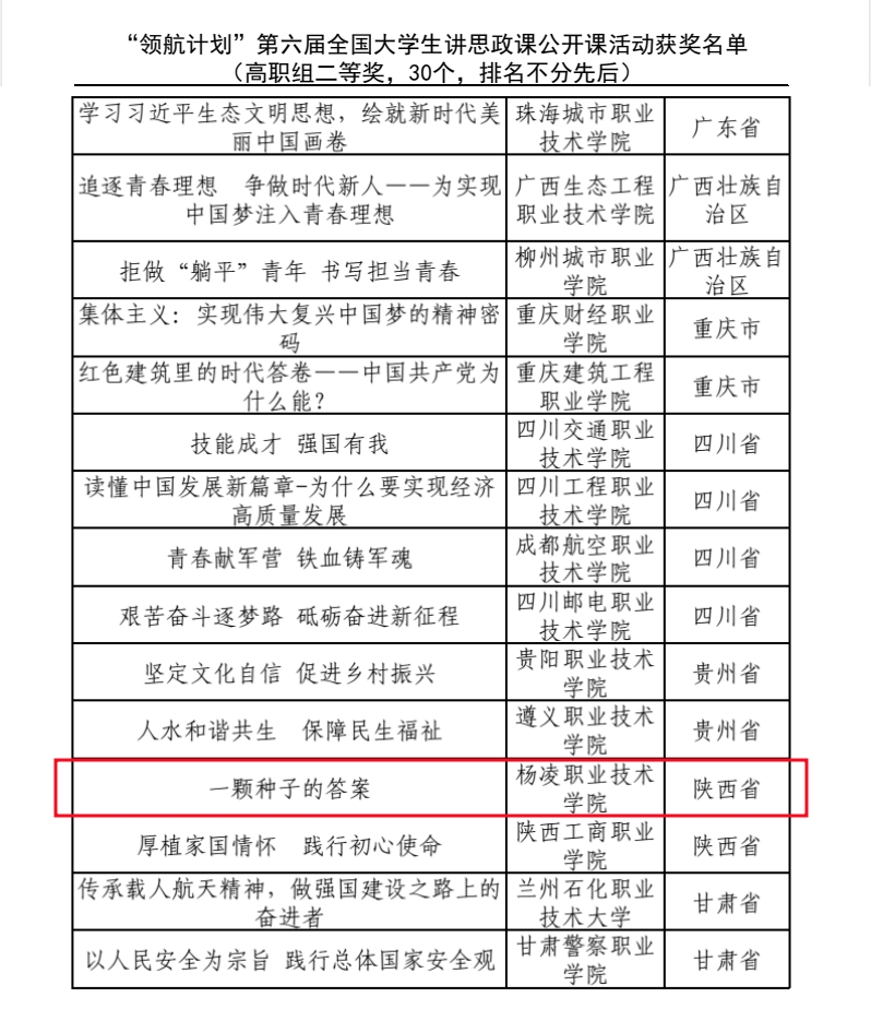 第六届全国高校大学生讲思政课公开课展示活动充分发挥高校思政课立德树人关键课程作用,坚持不懈用习近平新时代中国特色社会主义思想铸魂育人,引导学生深刻认识“两个确立”的决定性意义,增强“四个意识”,坚定“四个自信”。活动评选设置本科组和高职组,其中高职组评选出一等奖作品20件、二等奖作品30件、三等奖作品50件、优秀奖作品100件。《一颗种子的答案》作品立足我校办学特色,紧密结合学生专业,以全国著名小麦育种专家、我校研究员赵瑜老师的事迹为蓝本,以“种子梦”为主线,讲述了涉农高职学生树立理想、追求梦想的故事,从而增强学生学农爱农情怀,坚定强农兴农使命。