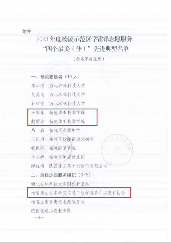 12月4日,杨凌示范区公布了2023年度杨凌示范区学雷锋志愿服务“四个最美(佳)”先进典型名单,我校学生王家乐、教师赵朋波荣获“最美志愿者”称号,信息工程学院青年志愿者协会获“最佳志愿服务组织”称号,生态环境工程学院“康乐西路社区支教助学”项目获得“最佳志愿服务项目”称号。