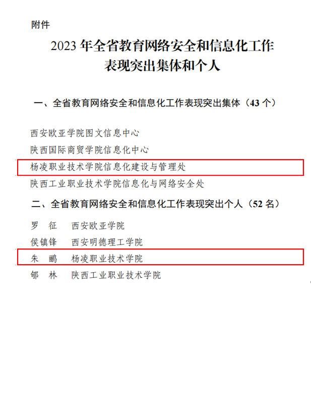 2月27日,陕西省教育厅发布了关于对2023年全省教育网络安全和信息化工作表现突出集体和个人表扬的通知,学校荣获全省教育网络安全和信息化工作表现突出集体,信息化建设与管理处朱鹂老师荣获全省教育网络安全和信息化工作表现突出个人。