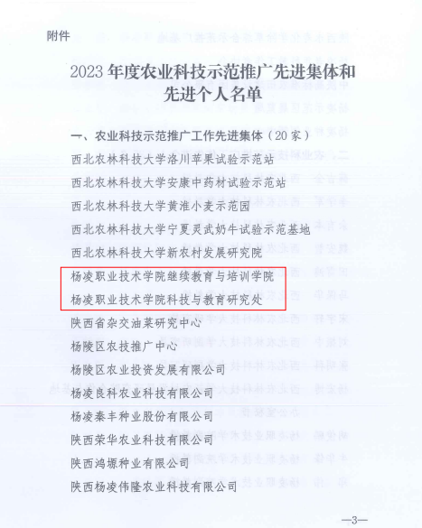 近日,中共杨凌示范区工委杨凌示范区管委会发布了关于表彰2023年度农业科技示范推广先进集体和先进个人的决定,学校继续教育与培训学院和科技与教育研究处荣获农业科技示范推广工作先进集体,胡俊鹏、牛华锋、郑伟、吴薇4名同志荣获农业科技示范推广工作先进个人。