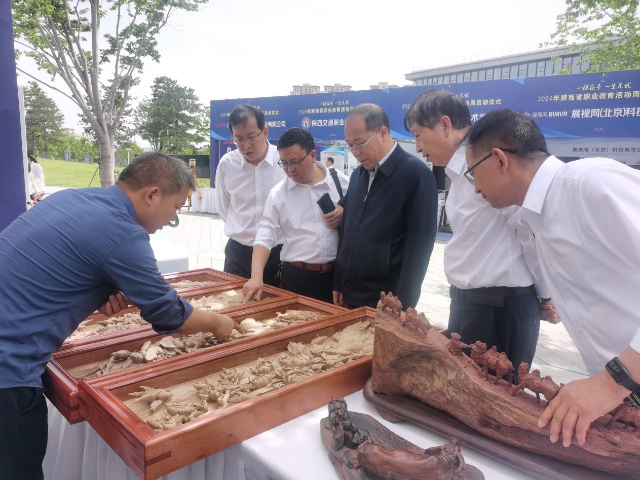 2024年陕西省职业教育活动周主题为“一技在手,一生无忧”,设置职业教育改革发展成效和技能展示等环节,我校围绕产教融合、科教融汇、国际合作交流等方面,通过图文、实物、学生展示和现场讲解等方式展示了双高建设以来所取得的成果。生态环境工程学院教师吴文军与2名同学现场展示了精湛木雕技艺。