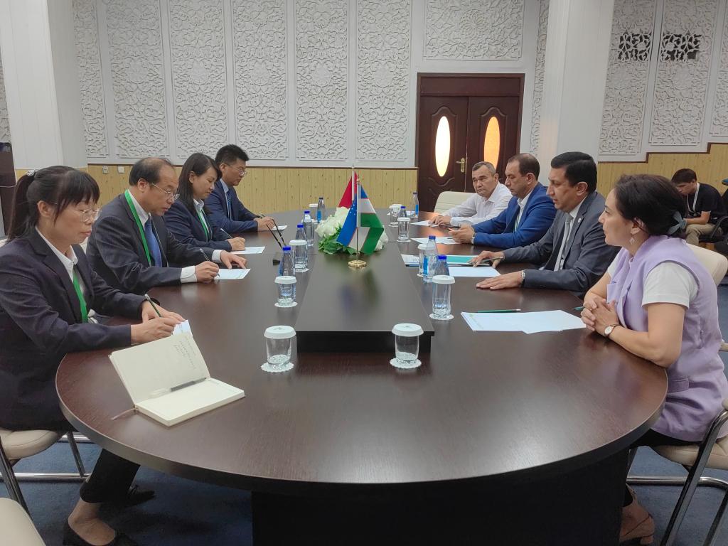 在乌兹别克斯坦塔什干国立农业大学,仲伟周参观了该校现代农业科研成果展,为“中国杨凌职业技术学院-乌兹别克斯坦塔什干国立农业大学专业技能培训基地”揭牌。双方围绕教育交流合作内容进行了深入讨论,并达成共识。
