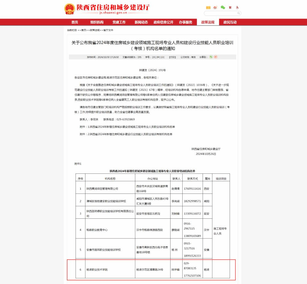 10月26日,陕西省住建厅公布2024年度住房城乡建设领域施工现场专业人员和建设行业技能人员职业培训(考核)机构名单。学校获批陕西省住房和城乡建设领域施工现场专业人员职业培训机构,将面向社会开展施工员、质量员、材料员、资料员、劳务员、标准员和机械员等培训服务。