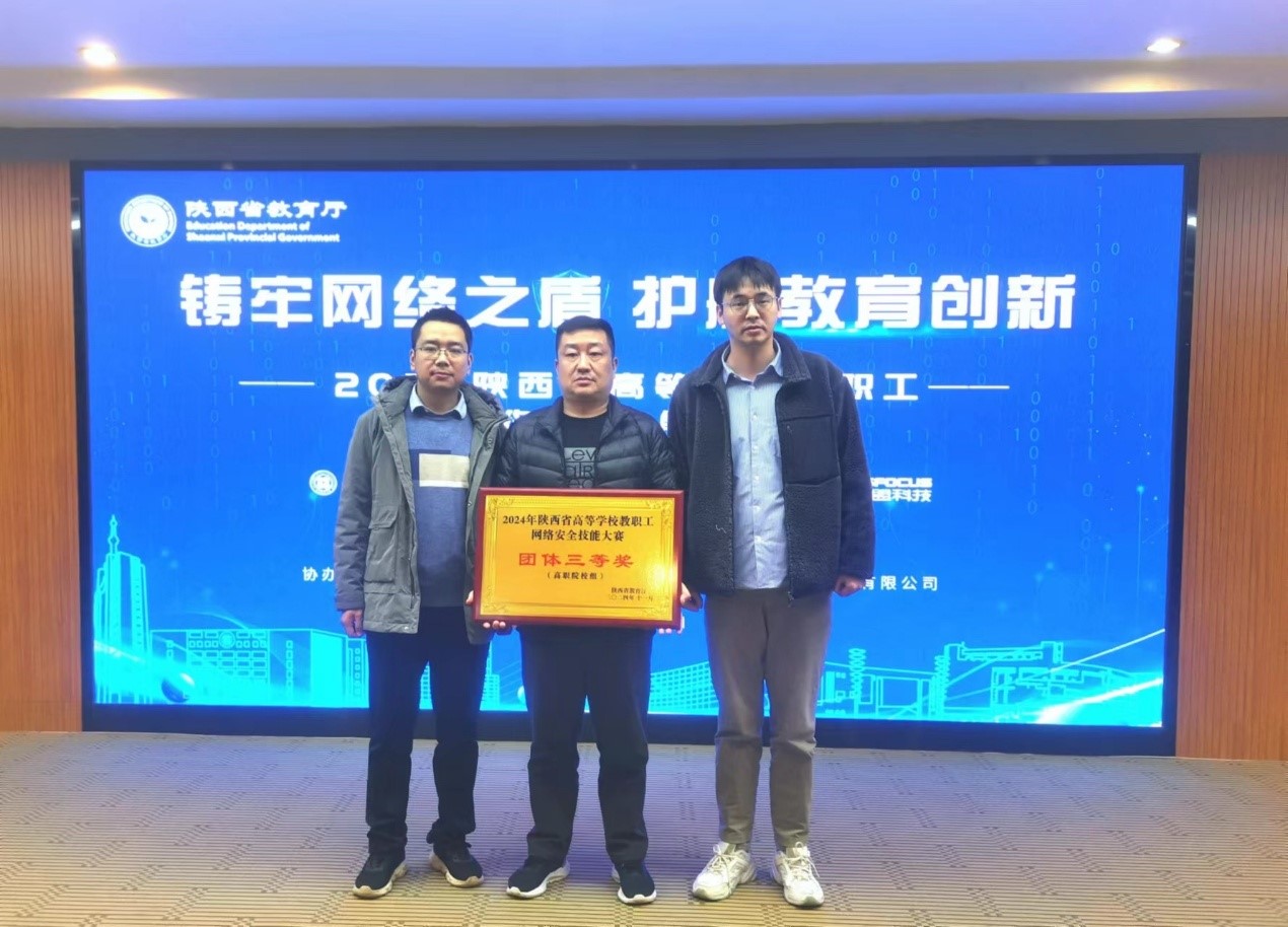 1129日,2024年首届陕西省高等学校教职工网络安全技能大赛决赛在西安邮电大学举行。本次大赛由陕西省教育厅主办,西安邮电大学、陕西省教育信息化管理中心承办,中国移动通信集团陕西有限公司、绿盟科技集团股份有限公司协办,共有66支高校代表队236名教职工参赛。我校获职业院校团体赛三等奖,信息化建设与管理处戴睿获个人赛二等奖。