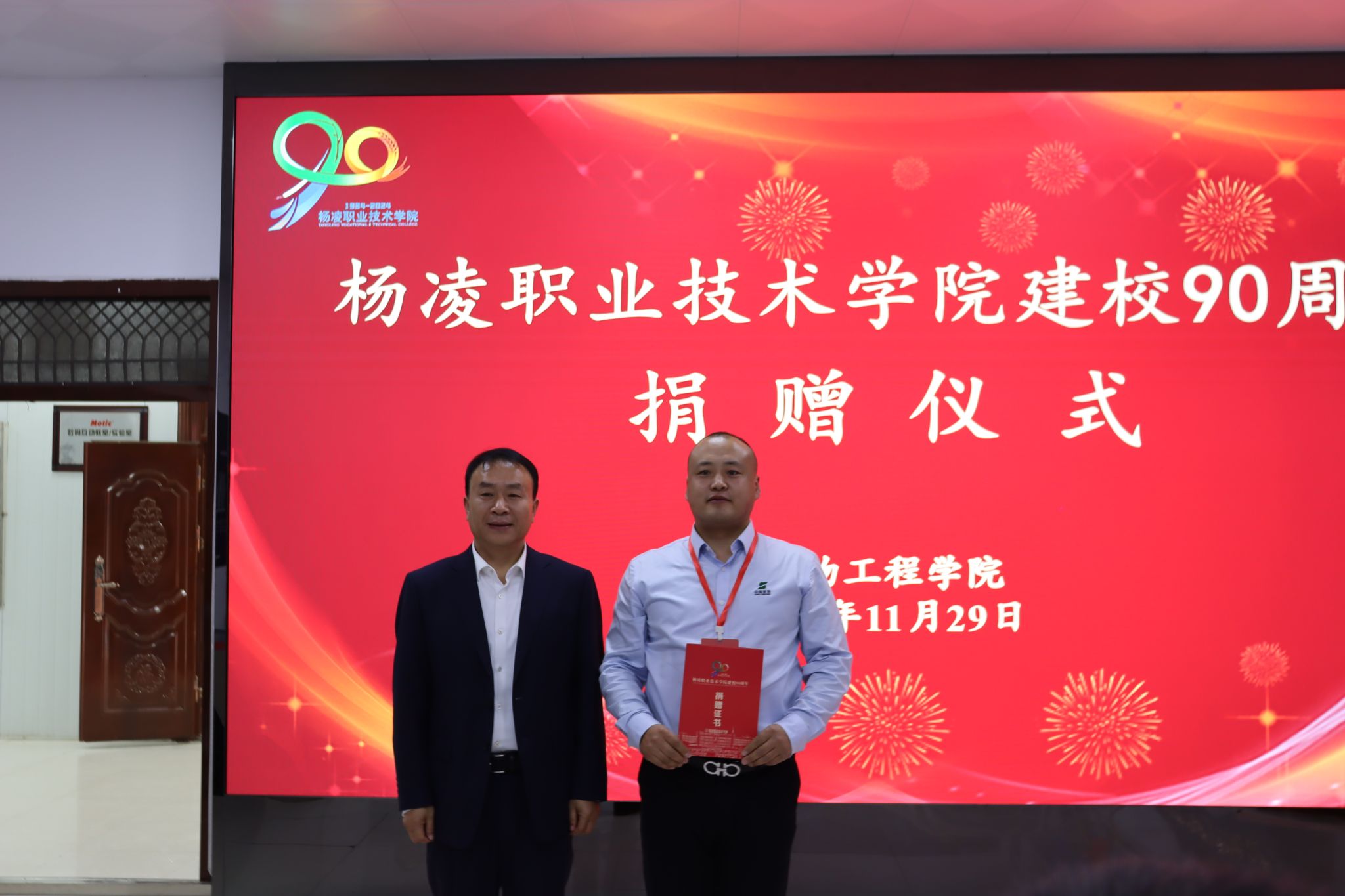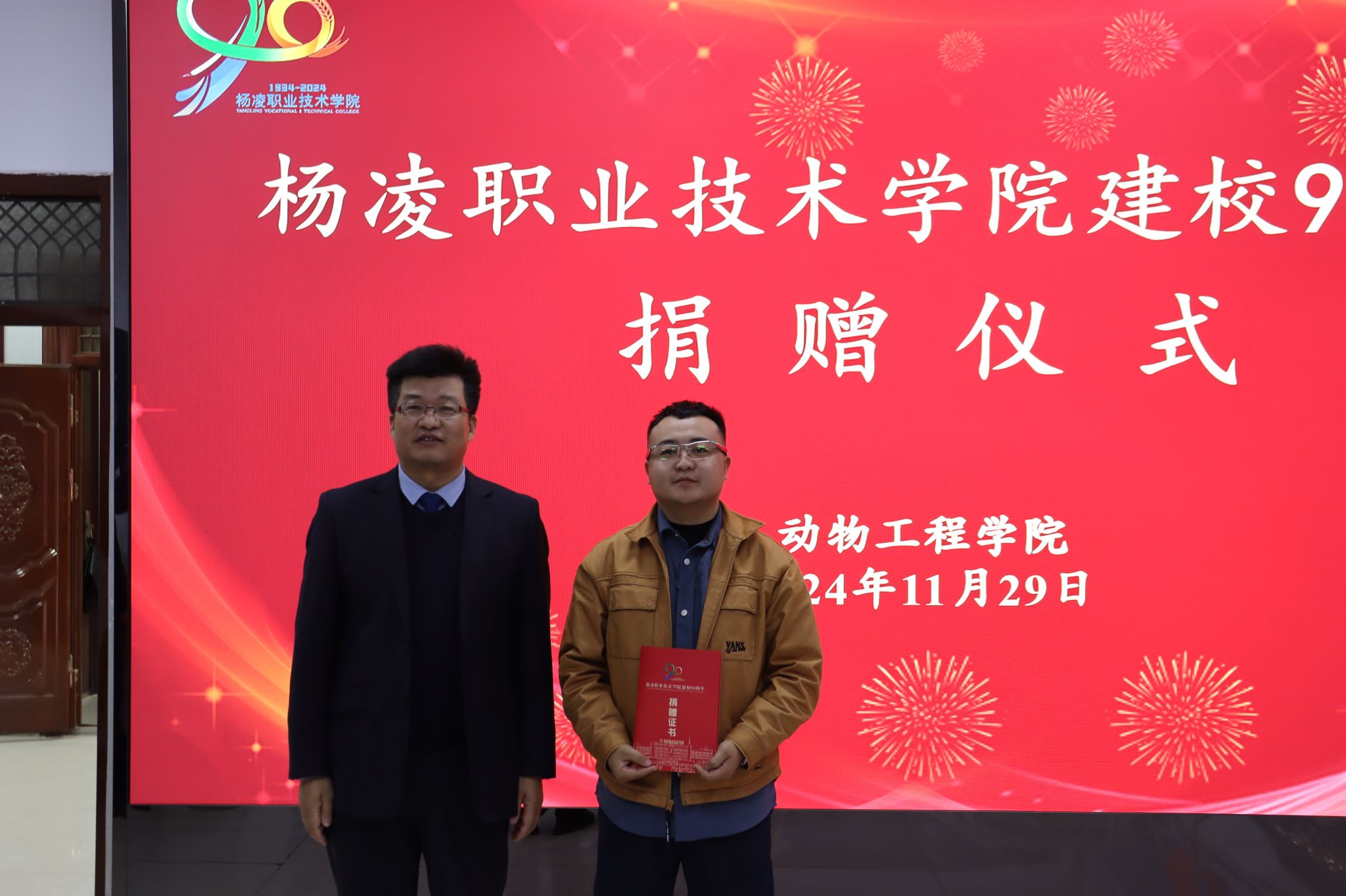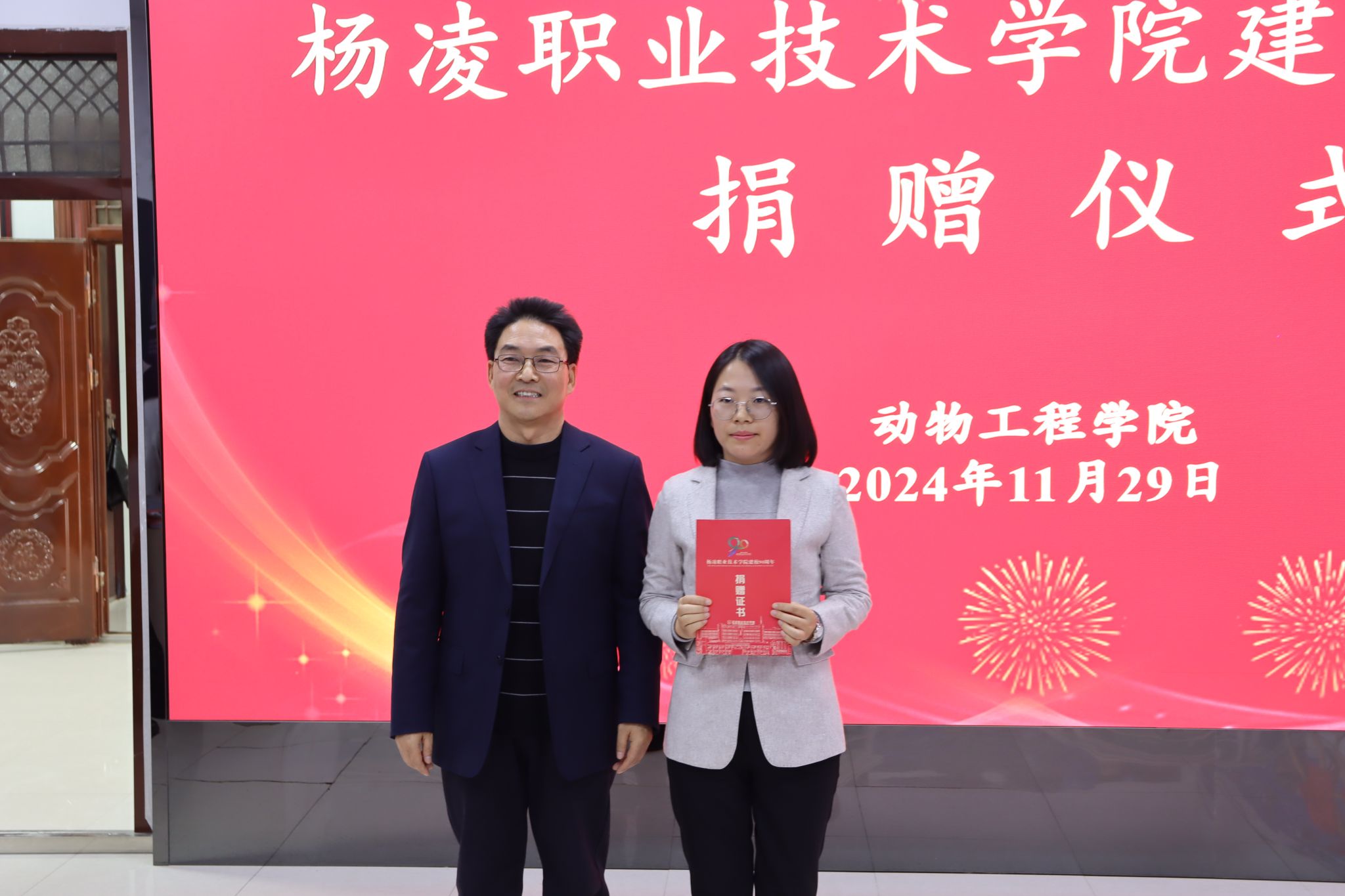 北京大北农科技集团股份有限公司、陕西石羊农业科技股份有限公司、内蒙古圣牧高科牧业有限公司、凉城县海高牧业养殖有限责任公司、新希望六和股份有限公司、西安京和动物医院有限公司和陕西兽小宠生物科技有限公司等企业分别向学校捐赠现金和物资,希望与学校深化合作。宠物行业校友联盟、1984级养蜂专业303班和1997级畜牧兽医431班分别捐赠现金、画册等。