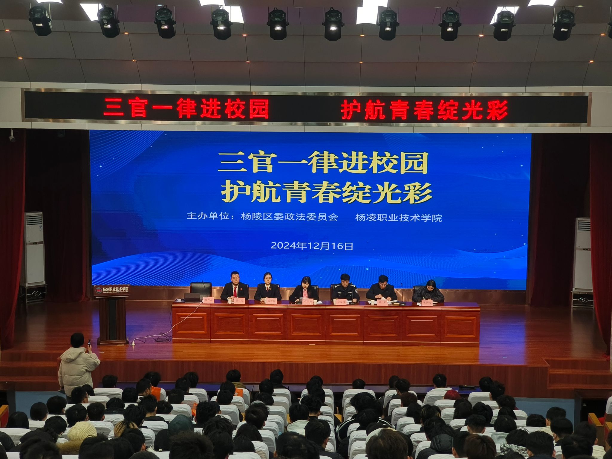 为增强学生法治意识和法律素养,12月16日上午,学校和杨陵区政法委员会共同主办,杨陵区公安局、法院、检察院、律师共同参与,开展了“三官一律进校园 护航青春绽光彩”主题教育活动。南校区300余名师生代表参加活动。