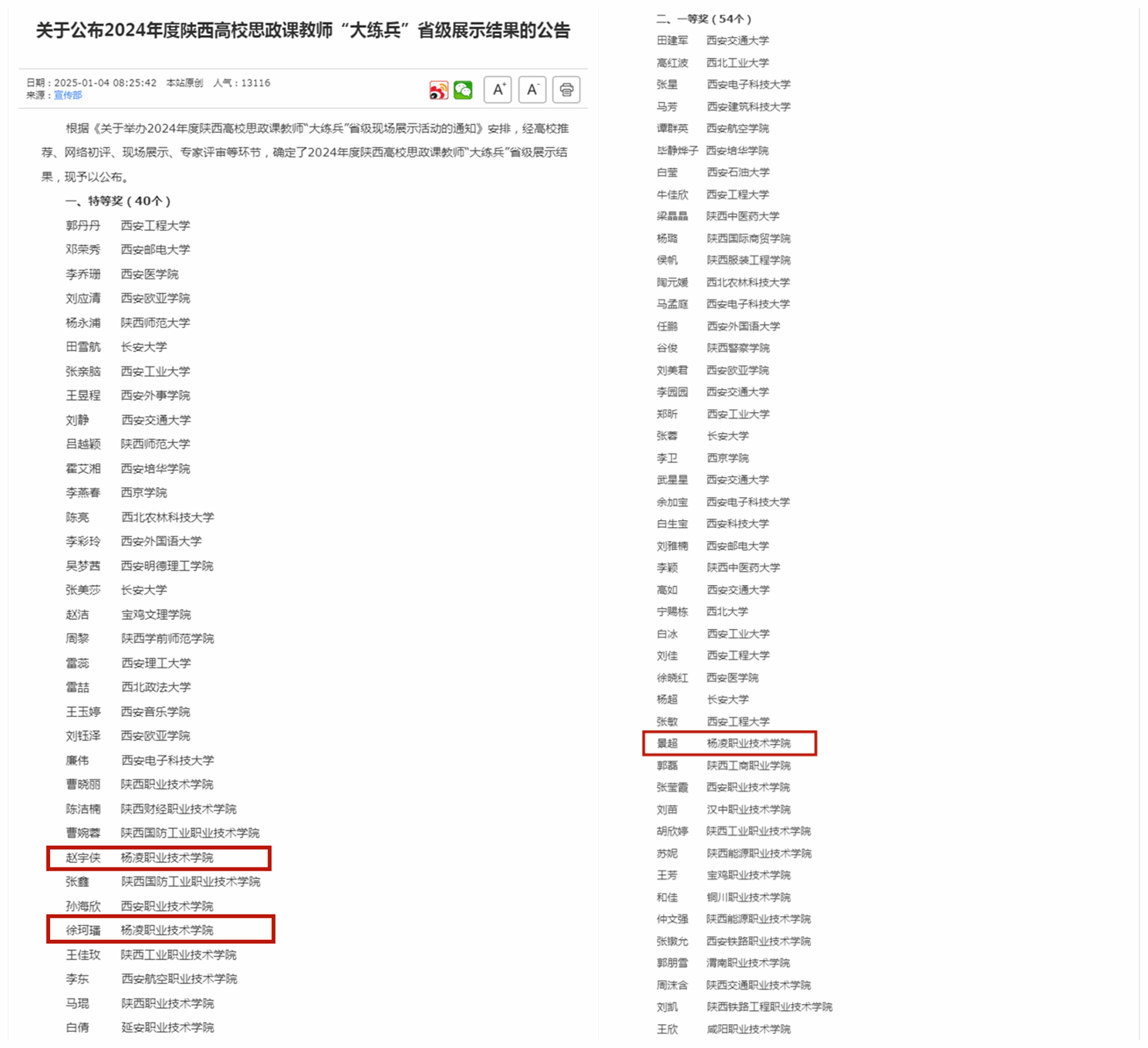 14日,省委教育工委、省教育厅公布了2024年度陕西高校思政课教师“大练兵”省级展示结果,我校马克思主义学院教师赵宇侠、徐珂璠荣获特等奖,景超荣获一等奖,综合成绩位列全省高校前列。