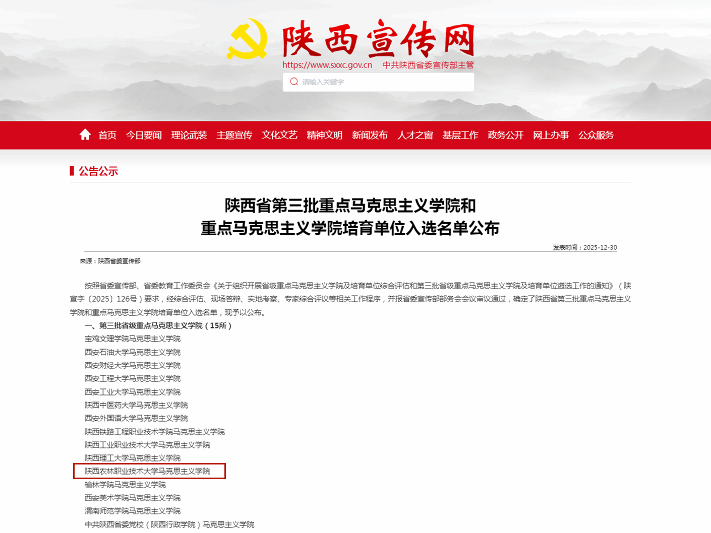 学校党委始终把马克思主义学院建设摆在重要位置,以省级重点马克思主义学院培育为抓手,系统谋划、创新举措,不断激发各方建设主体活力,推动马克思主义学院发展不断迈上新台阶。2022年入选省重点马克思主义学院培育单位以来,学校制定《省级重点马克思主义学院建设实施方案(2023—2025年)》,构建党委统一领导、党政齐抓共管、学院和职能部门层层落实的各负其责、协同配合的工作格局,着力推动思政课建设与党的创新理论武装同频共振。同时,通过制定并实施思政课教学提升行动方案和思政课教师队伍建设方案、创新思政课教学模式、成立课程思政研究中心、实施“后稷正禾”育人工程、打造“一址三馆”育人阵地、建设数智思政研学中心,以及牵头组建陕西高职院校“大思政课”建设协同发展联盟、杨凌大中小学思政课一体化协同中心等举措,全面推进“大思政课”建设。