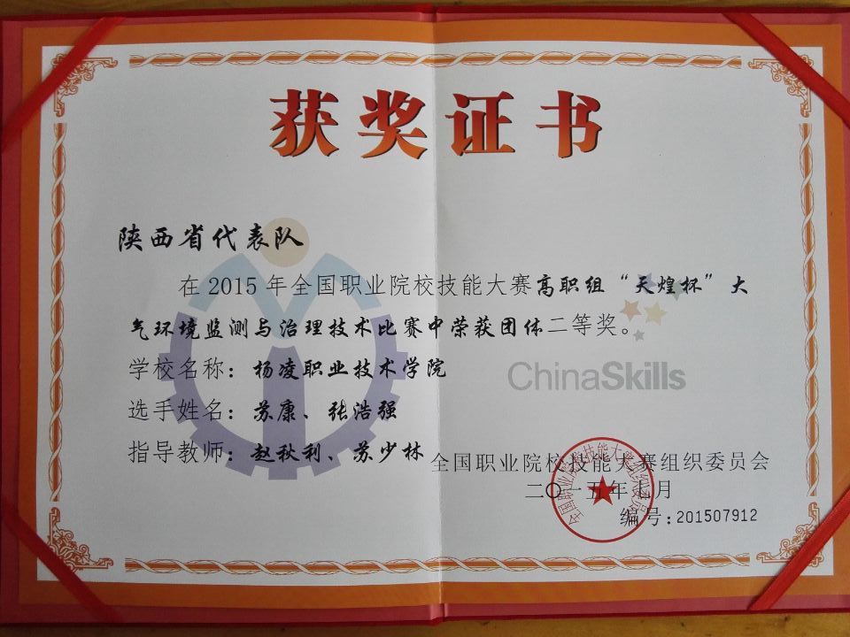 74日,由教育部主办的全国职业院校高职组“天煌杯”大气环境监测与治理技术大赛在天津现代职业技术学院闭幕。我院环境监测与治理技术专业13031班苏康、张浩强同学代表陕西省参赛并获得了团体二等奖。