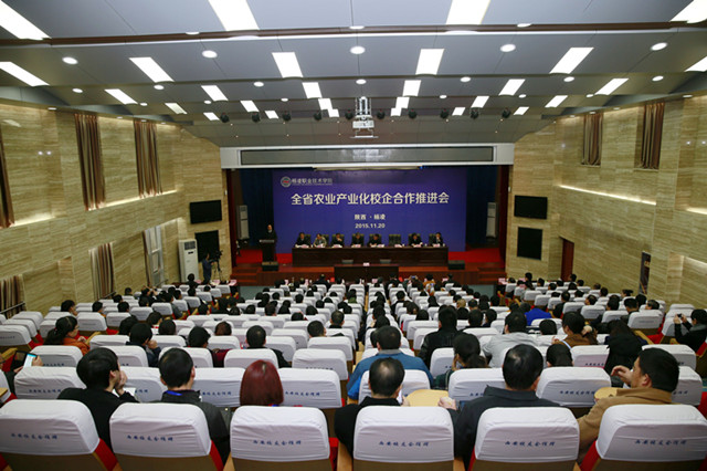 为进一步促进全省农业产业化龙头企业转型升级,构建产学研一体化的特色现代农业支撑体系,进一步推进农业产业化企业与杨凌职业技术学院的校企深度合作,11月20日,由省农业厅和我院共同主办的全省农业产业化校企合作推进会在我院举行。省农业厅副厅长高爱平,省教育厅副厅长王紫贵,示范区管委会主任助理董胜利,学院党委书记赵曼出席并致辞,学院党委副书记、院长王周锁主持推进会。
