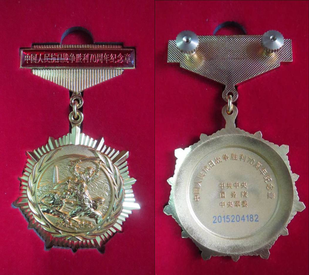 2015年在庆祝抗日战争胜利70周年之际,中共中央、国务院、中央军委为黄绪森颁发“中国人民抗日战争胜利70周年纪念章”一枚。