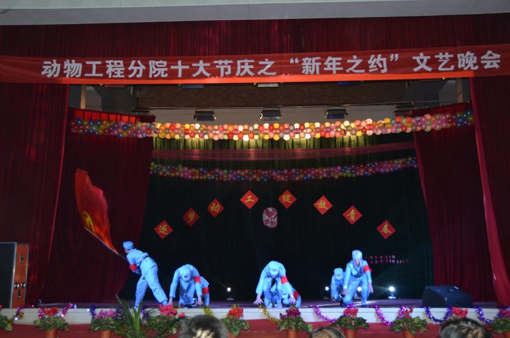 12月26日晚,西校区大礼堂炫光闪耀、歌声飞扬,动物工程分院十大节庆主题教育活动之“新年之约”文艺晚会在此隆重举行。学生处、动物工程分院负责人,陕西康达尔农牧科技有限公司销售总监闫树林、销售经理刘坤,分院辅导员、班主任、学生1200余人观看了晚会。热情奔放的陕北腰鼓《开门红》拉开了晚会的帷幕;小品《迎新生》讲述了校园生活乐趣,幽默诙谐、令人捧腹;舞蹈《红军不怕远征难》诠释了红军克服千难万阻完成了二万五千里长征的伟大壮举,献礼纪念红军长征胜利80周年;街舞《篮球宝贝》激情四射,张扬青春活力;配乐诗朗诵《致青春》高亢激昂、饱含深情;二胡独唱《莫尼山》悠扬委婉,将晚会推向了高潮;集双节棍、剑术、跆拳道等为一体的武术表演《武林风》落下了晚会的帷幕。