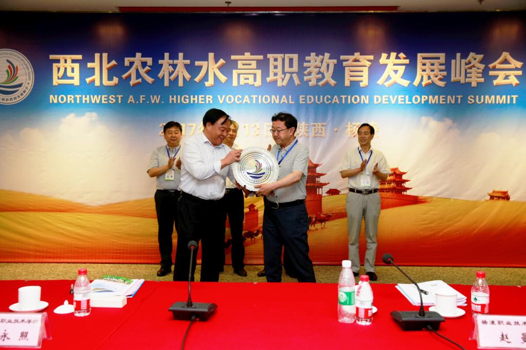 王周锁与杨广泉交接西北农林水高职教育发展峰会轮值主席杯