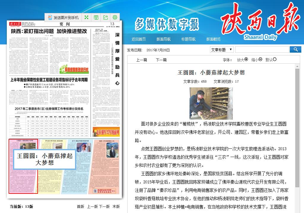 王圆圆的家乡佛坪地处秦岭深处,是国家级贫困县。结合所学开展了充分的调研,2015年毕业后,王圆圆就回陈家坝镇成立了佛坪秦山源现代农业开发有限公司,注册了品牌“秦农珍品”,利用电商销售家乡的农产品。同时,王圆圆还加入了陈家坝袋料香菇栽培专业技术协会,在他的推动和杨凌职院老师们的技术指导下,袋料香菇产业初显雏形。本土种植+电商销售,在当地政府和学校的技术支撑下,王圆圆流转起陈家坝镇孔家湾村的140余亩复垦土地,建起了陈家坝食用菌产业示范园。