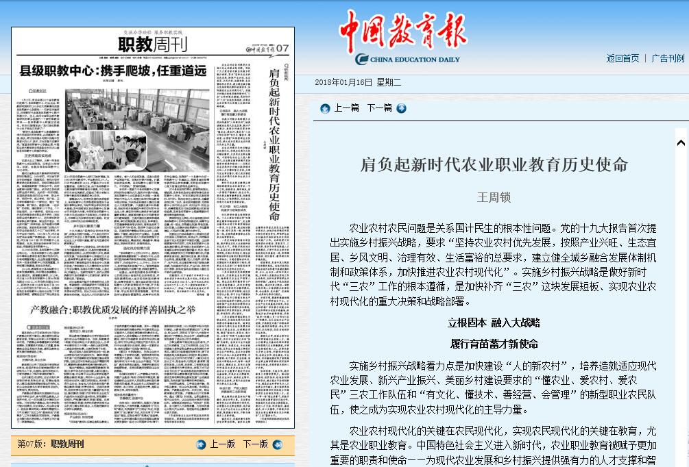 1月16日,《中国教育报》7版刊发了我院院长王周锁署名文章《肩负起新时代农业职业教育历史使命》,全文刊载如下(详情进入):