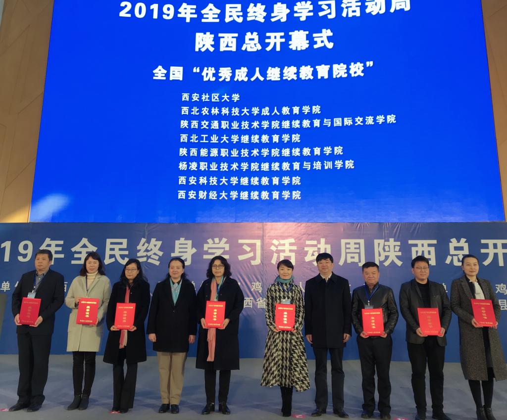 12月6日上午,陕西省2019年“全国终身学习活动周”开幕式在宝鸡举行。陕西省教育厅副厅长朱晓渭出席开幕式并讲话,教育厅职成处处长何玉麒宣读了2019全国“优秀成人继续教育院校”、“百姓学习之星”、“终身学员品牌”获奖名单,我院荣获“全国优秀成人继续教育院校”称号。