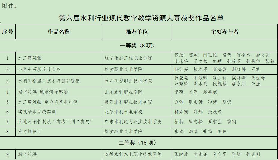 本次大赛由中国水利教育协会主办,旨在提升水利院校教师信息化教学水平,以信息化带动水利教育现代化,推进水利行业优质数字教育培训资源。本次大赛共收到推荐参赛作品96项,评出获奖作品55项,其中一等奖8项,二等奖18项,三等奖29项。水利工程分院作为我院主要参赛单位,报送的参赛作品完成了课程在线教学视频、教学PPT、电子教材、习题库等配套资源建设,内容丰富详实,能够较好满足立体化学习需求。