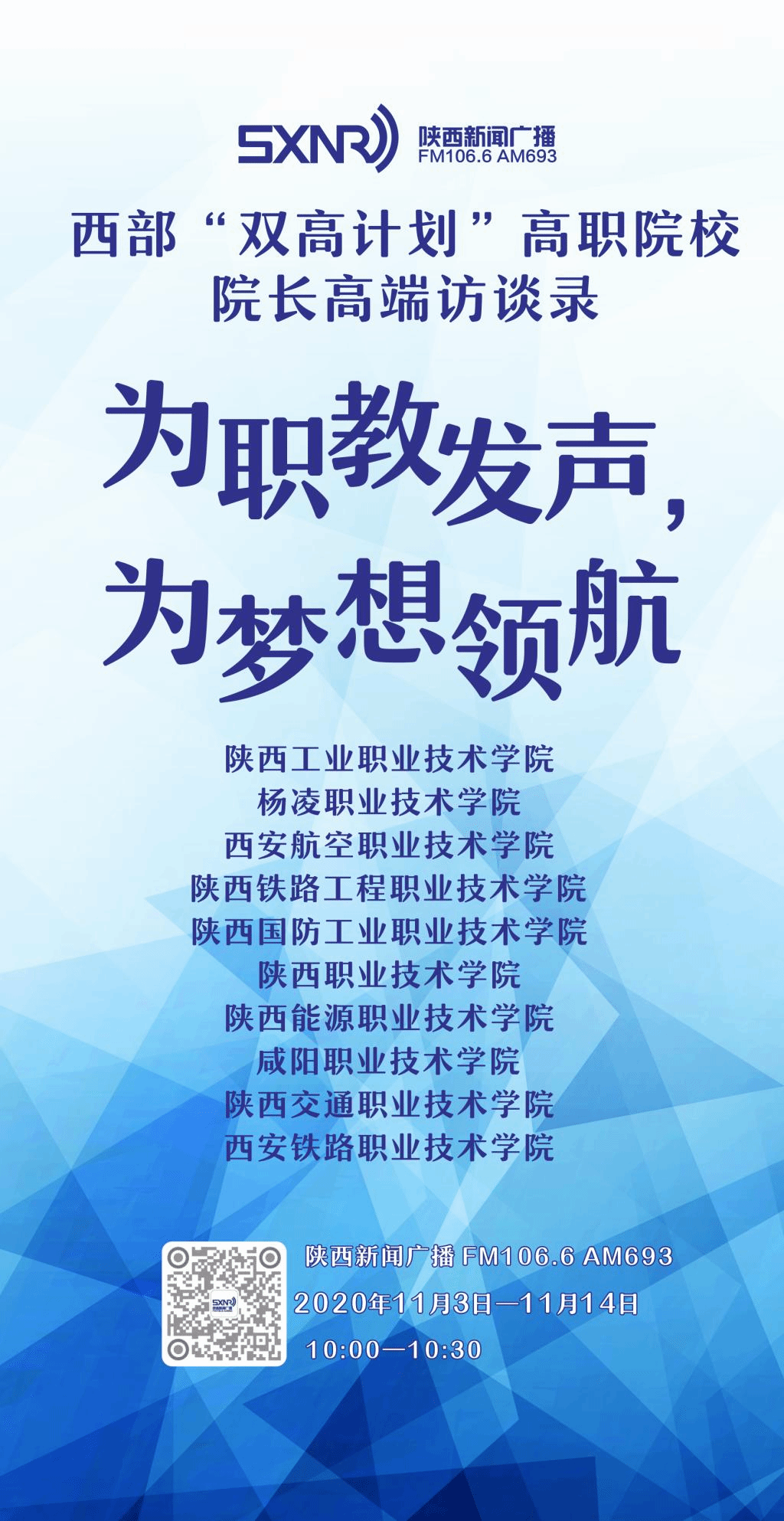 11月3日上午,校长王周锁受邀做客陕西新闻广播《1066教育直通车》节目直播间作首场《西部“双高计划”院长高端访谈录》,就学校基本情况、特色专业“双高计划”建设思路和主要目标、“双高”计划重要任务、进展情况和效果等问题接受访谈。
