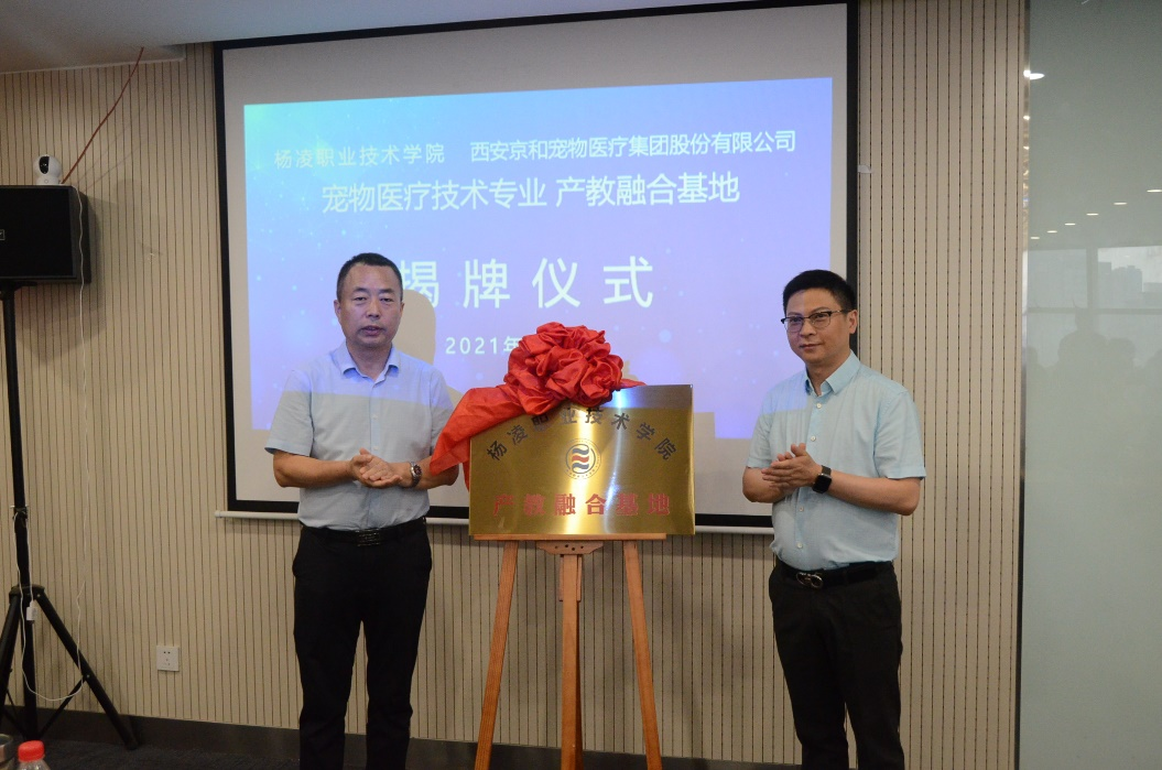 在西安京和动物医院有限公司,胡俊鹏和医院董事长孙均共同为产教融合基地揭牌。张振仓代表学校与医院签订了校企深度合作协议。宠物科技教研室主任吴礼平汇报了“宠医菁英班”工作进展情况,重点介绍了“双主体、三循环、四对接”人才培养模式。我校优秀毕业生、西安京和动物医院京宝分院院长赵曼作为毕业生代表,分享了她在京和的工作经历。