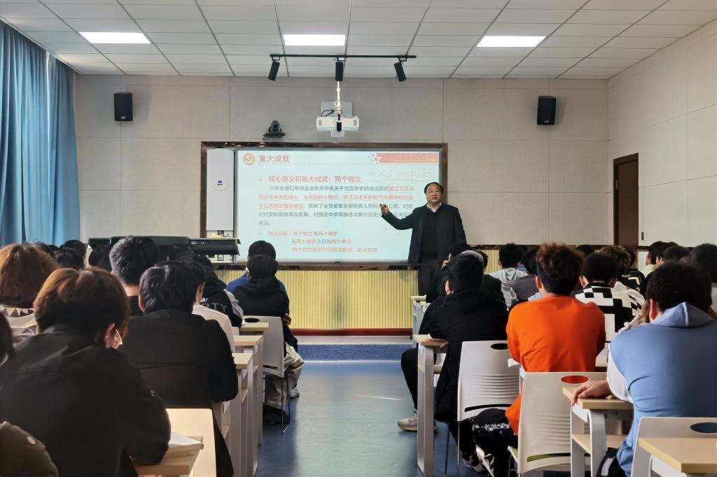 11月25日下午,校长王周锁以《赓续红色血脉 凝聚奋进力量——学习贯彻党的十九届六中全会精神》为主题,为建筑工程学院建工21131、建工21132两个班级讲了一堂思政课。马克思主义学院副院长张伟和教师代表聆听了讲课。