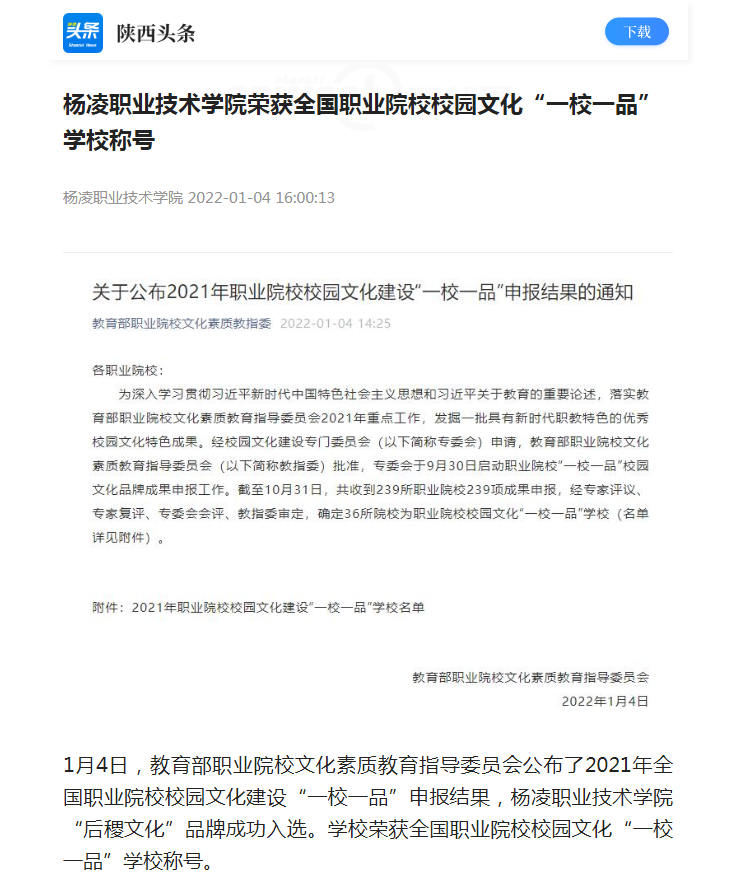 【陕西头条】杨凌职业技术学院荣获全国职业院校校园文化“一校一品”学校称号