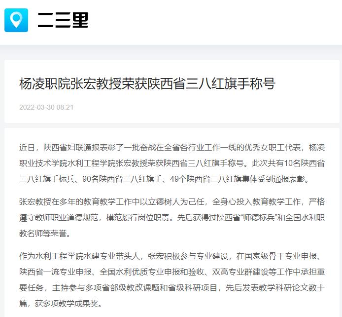 【二三里】杨凌职院张宏教授荣获陕西省三八红旗手称号
