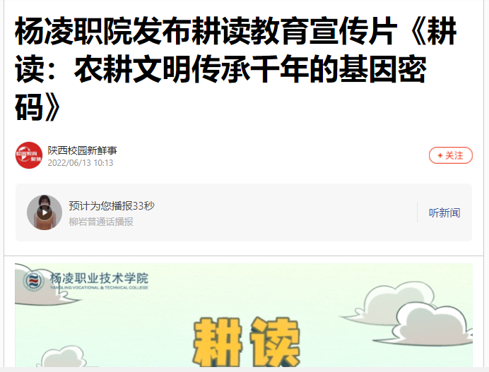 【搜狐新闻】杨凌职院发布耕读教育宣传片《耕读:农耕文明传承千年的基因密码》