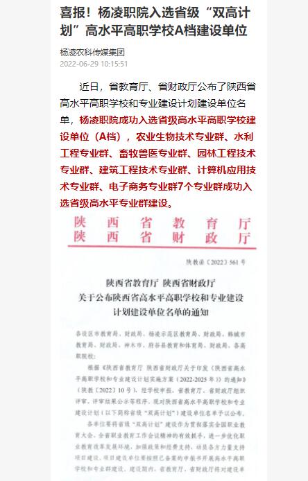 【杨凌农科传媒集团】喜报!杨凌职院入选省级“双高计划”高水平高职学校A档建设单位