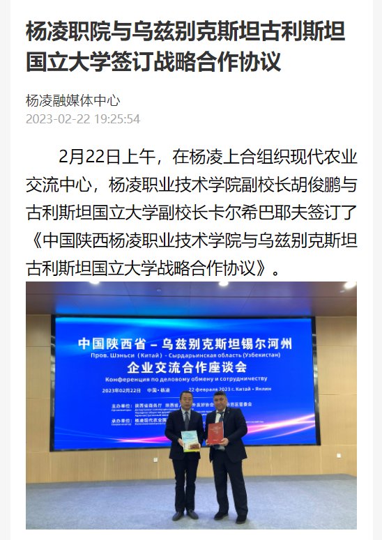 2月22日上午,在杨凌上合组织现代农业交流中心,杨凌职业技术学院副校长胡俊鹏与古利斯坦国立大学副校长卡尔希巴耶夫签订了《中国陕西杨凌职业技术学院与乌兹别克斯坦古利斯坦国立大学战略合作协议》。