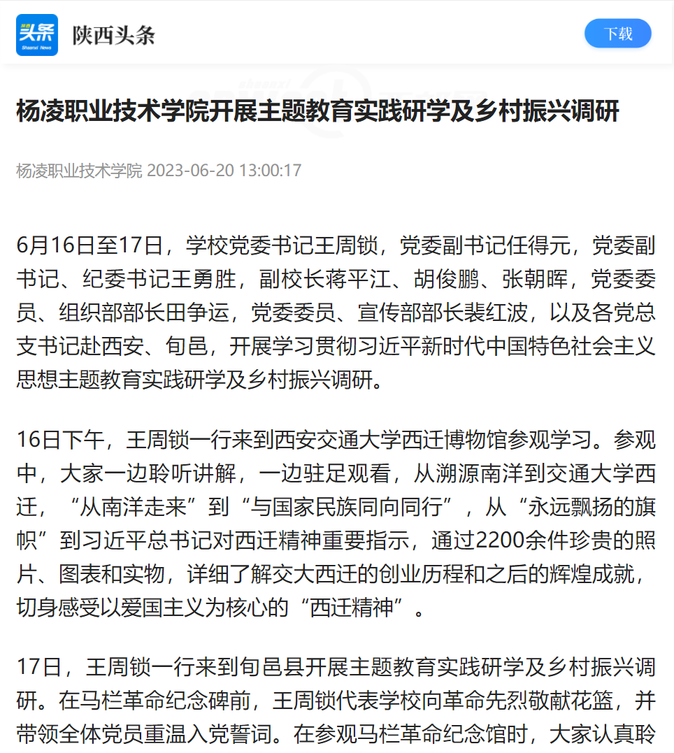 6月16日至17日,学校党委书记王周锁,党委副书记任得元,党委副书记、纪委书记王勇胜,副校长蒋平江、胡俊鹏、张朝晖,党委委员、组织部部长田争运,党委委员、宣传部部长裴红波,以及各党总支书记赴西安、旬邑,开展学习贯彻习近平新时代中国特色社会主义思想主题教育实践研学及乡村振兴调研。