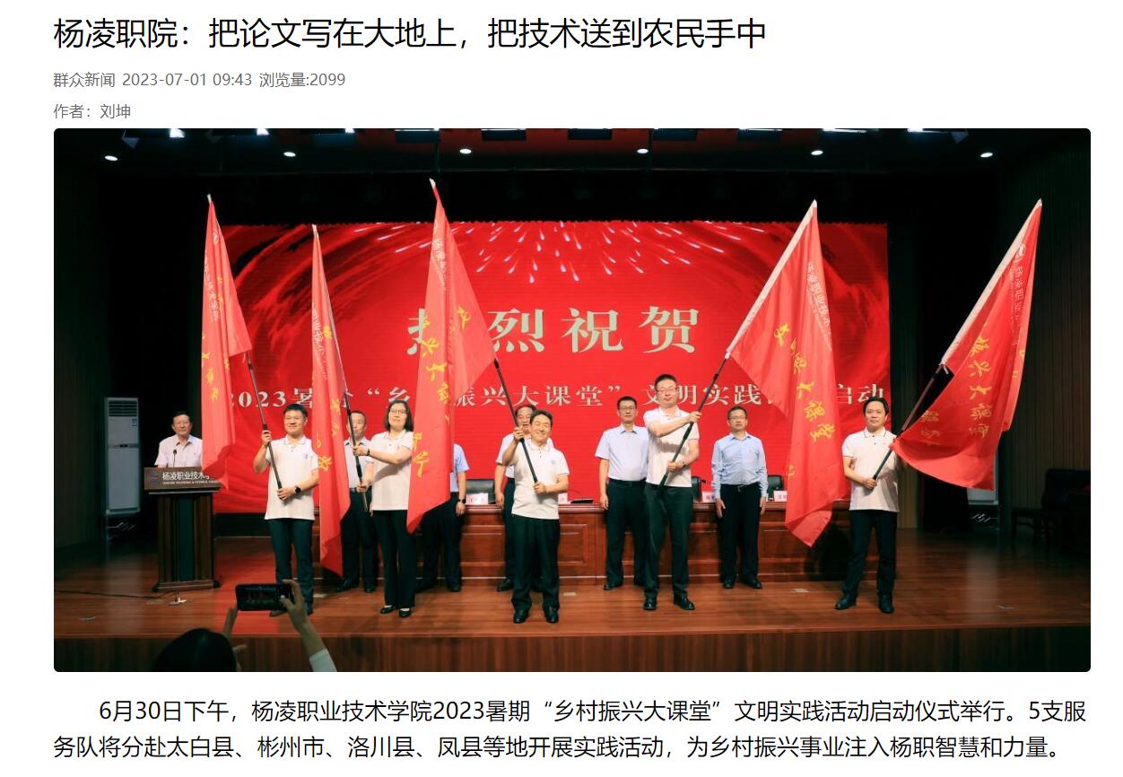 6月30日下午,杨凌职业技术学院2023暑期“乡村振兴大课堂”文明实践活动启动仪式举行。5支服务队将分赴太白县、彬州市、洛川县、凤县等地开展实践活动,为乡村振兴事业注入杨职智慧和力量。