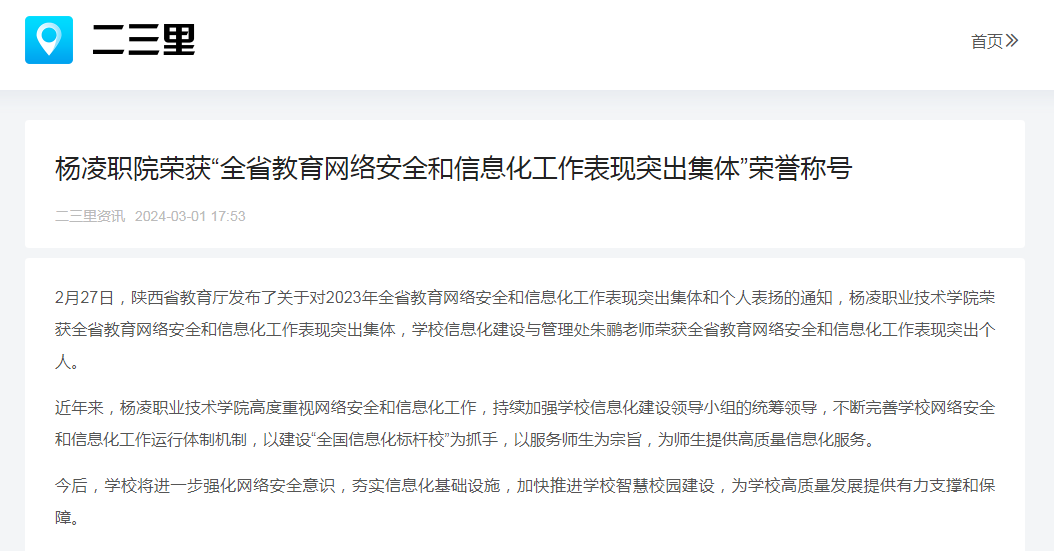 【二三里】杨凌职院荣获“全省教育网络安全和信息化工作表现突出集体”荣誉称号