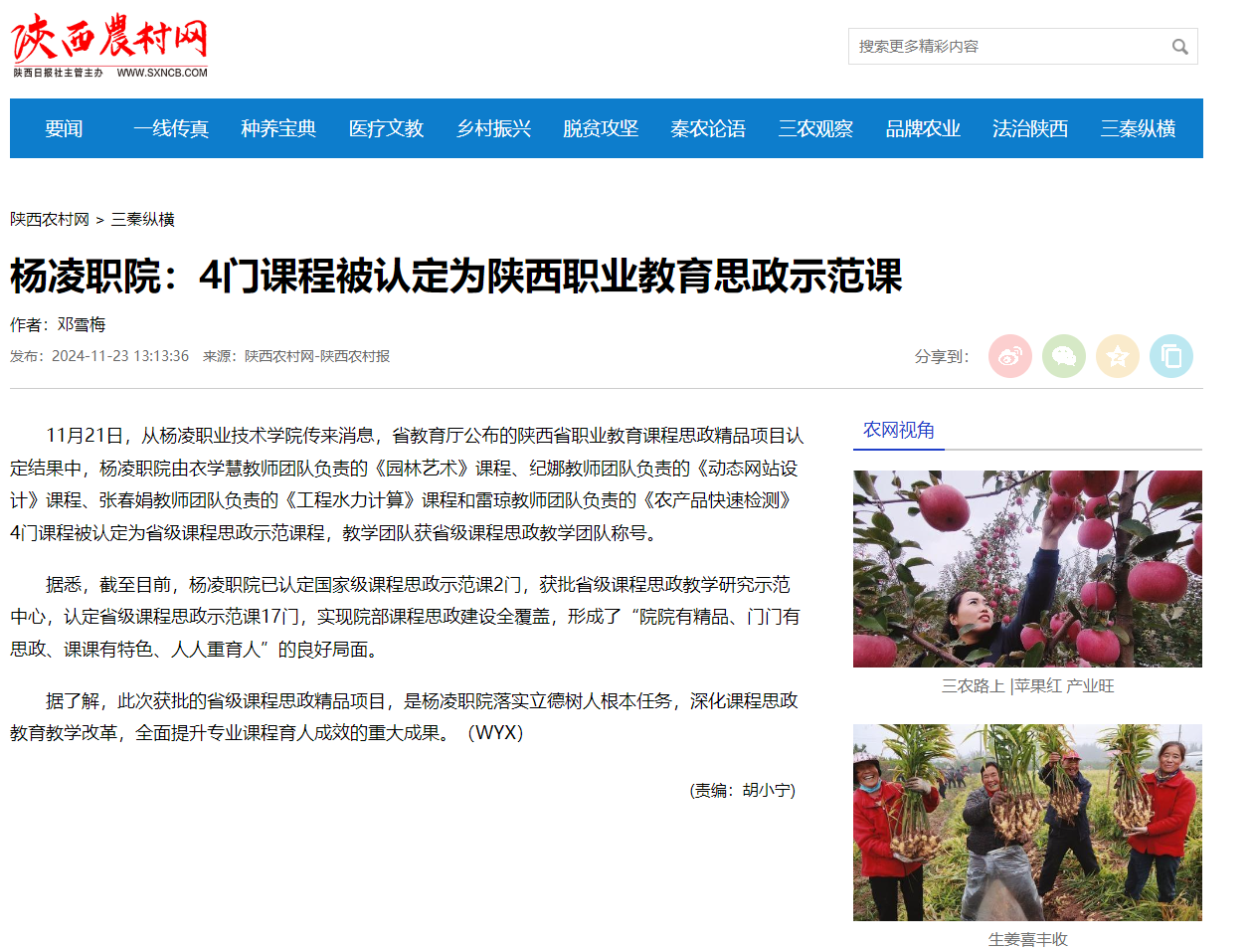 【陕西农村网】杨凌职院:4门课程被认定为陕西职业教育思政示范课