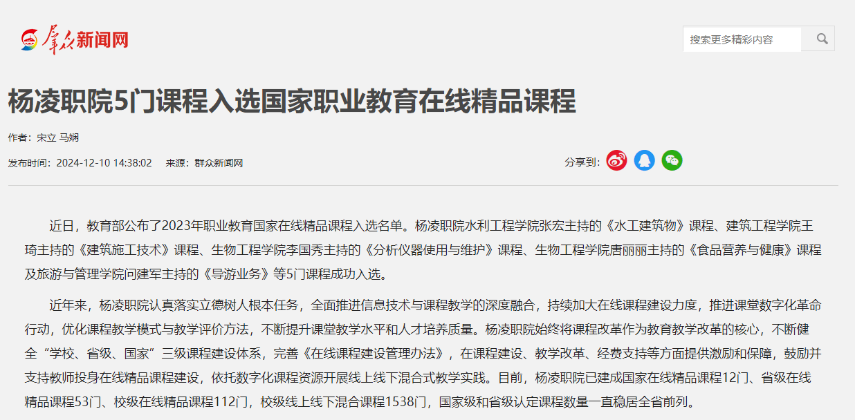 近日,教育部公布了2023年职业教育国家在线精品课程入选名单。杨凌职院水利工程学院张宏主持的《水工建筑物》课程、建筑工程学院王琦主持的《建筑施工技术》课程、生物工程学院李国秀主持的《分析仪器使用与维护》课程、生物工程学院唐丽丽主持的《食品营养与健康》课程及旅游与管理学院问建军主持的《导游业务》等5门课程成功入选。