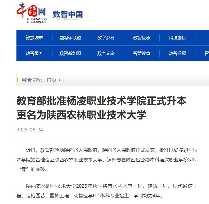 近日,教育部致函陕西省人民政府,陕西省人民政府正式发文,批准以杨凌职业技术学院为基础设立陕西农林职业技术大学。这标志着陕西省公办本科层次职业学校实现“零”的突破。