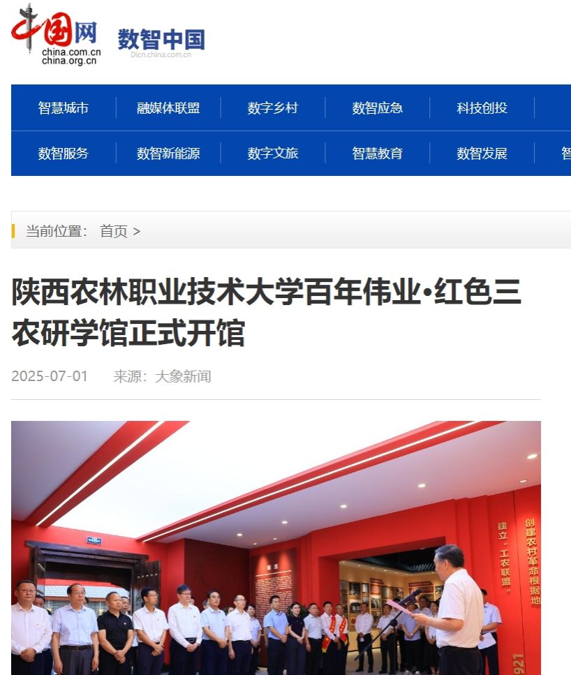 6月30日上午,百年伟业·红色三农研学馆开馆仪式在陕西农林职业技术大学举行。杨凌示范区党工委书记史高领,省委农办副主任、省农业农村厅副厅长陈文,杨凌示范区党工委委员、管委会副主任张小明,西北农林科技大学党委副书记庄世宏,学校党委书记韩明军、校长仲伟周,全国农业展览馆(中国农业博物馆)当代农业研究部主任杨卫东等出席开馆仪式。开馆仪式由学校党委副书记刘瑞明主持。