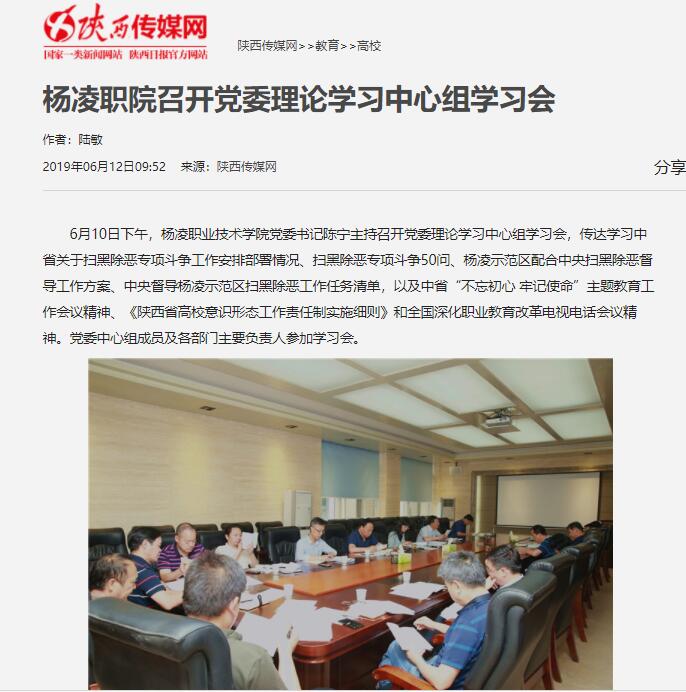 6月10日下午,杨凌职业技术学院党委书记陈宁主持召开党委理论学习中心组学习会,传达学习中省关于扫黑除恶专项斗争工作安排部署情况、扫黑除恶专项斗争50问、杨凌示范区配合中央扫黑除恶督导工作方案、中央督导杨凌示范区扫黑除恶工作任务清单,以及中省“不忘初心 牢记使命”主题教育工作会议精神、《陕西省高校意识形态工作责任制实施细则》和全国深化职业教育改革电视电话会议精神。党委中心组成员及各部门主要负责人参加学习会。