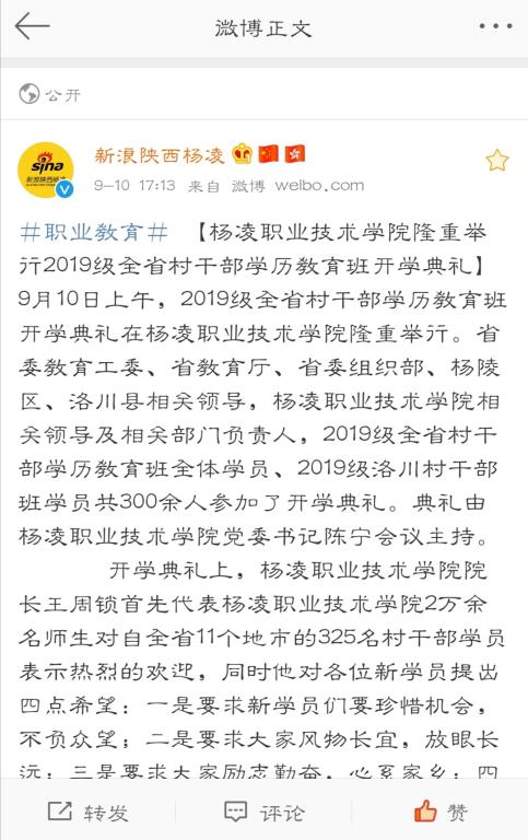 【新浪陕西杨凌】杨凌职业技术学院隆重举行2019级全省村干部学历教育班开学典礼