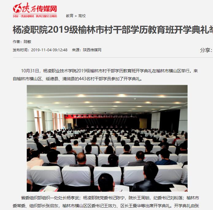 1031日,杨凌职业技术学院2019级榆林市村干部学历教育班开学典礼在榆林市横山区举行。来自榆林市横山区、绥德县、清涧县的443名村干部学员参加了开学典礼。