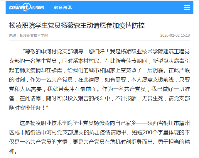 “尊敬的申河村党支部领导:您们好!我是杨凌职业技术学院建筑工程党支部的一名学生党员,同时系本村村民。在此新春佳节期间,新型冠状病毒引起的肺炎疫情却在肆虐,给我们的城市和国家上空笼罩了一层阴霾。在此严峻的时刻,作为一名共产党员,在此请愿,如有需要,本人愿意支援前线,只要党和人民需要,我就带头冲在最前面。作为一名共产党员,我已做好一切准备,在此请愿,随时可以投入艰苦的战斗中,不计报酬,无畏生死,请党支部随时安排任务!”