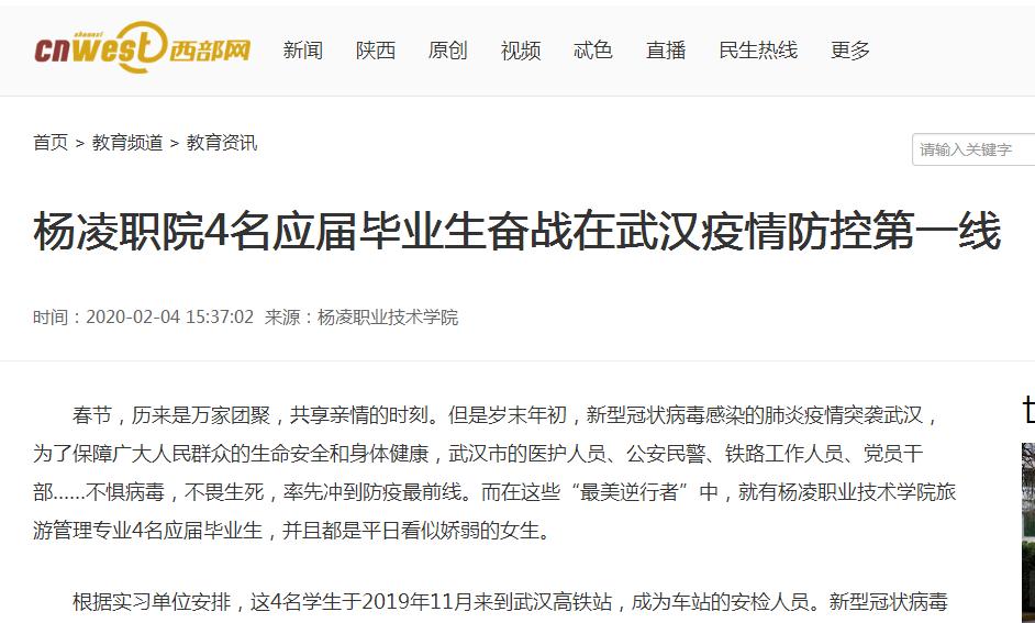 春节,历来是万家团聚,共享亲情的时刻。但是岁末年初,新型冠状病毒感染的肺炎疫情突袭武汉,为了保障广大人民群众的生命安全和身体健康,武汉市的医护人员、公安民警、铁路工作人员、党员干部……不惧病毒,不畏生死,率先冲到防疫最前线。而在这些“最美逆行者”中,就有杨凌职业技术学院旅游管理专业4名应届毕业生,并且都是平日看似娇弱的女生。