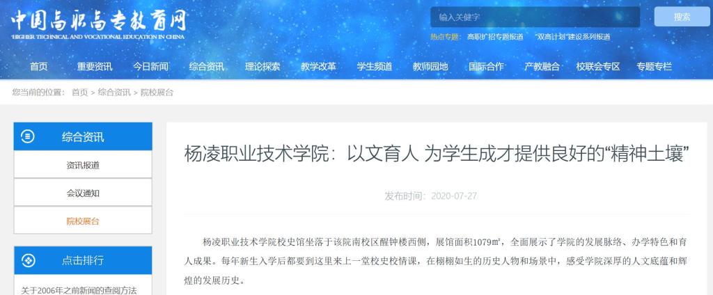 为丰富校园文化育人内涵、增强校园文化育人实效,杨凌职业技术学院还将文化育人与师德师风建设相结合,培育具备“学高身正”的教师文化。开展师德标兵“讲报告”、教师“学习政治理论”、教师“做学生楷模”和评选师德先进典型活动,构建“讲、学、做、评”四位一体师德建设体系,使教师成为校园文化的引领者、传承者;与专业建设发展相结合,培育富有“工匠精神”的专业文化。根据专业特点,深入挖掘各专门课程所蕴含的德育元素,并通过设立院士工作室、聘任行业技能大师,积极搭建“工匠精神”培育的平台;与思政课堂教学相结合,培育充满“趣味魅力”的课堂文化。深入推进思政课信息化建设和线上线下混合式教学,探索思政课“三环联动”教学模式,不断提升教学实效性和学生获得感;与学生实践活动相结合,培育蕴含“家国情怀”的实践文化。在专业实训、课外活动、顶岗实习、社会实践、技能竞赛、志愿服务等活动中融入文化育人元素,使学生在实践中深化爱国、荣校的认知。