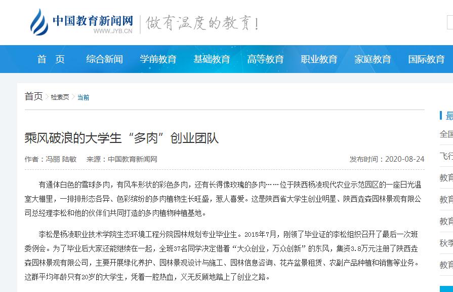 李松是杨凌职业技术学院生态环境工程分院园林规划专业毕业生。2015年7月,刚领了毕业证的李松组织召开了最后一次班委例会。为了毕业后大家还能继续在一起,全班37名同学决定借着“大众创业,万众创新”的东风,集资3.8万元注册了陕西垚森园林景观有限公司,主要开展绿化养护、园林景观设计与施工、园林信息咨询、花卉盆景租赁、农副产品种植和销售等业务。这群平均年龄只有20岁的大学生,凭着一腔热血,义无反顾地踏上了创业之路。